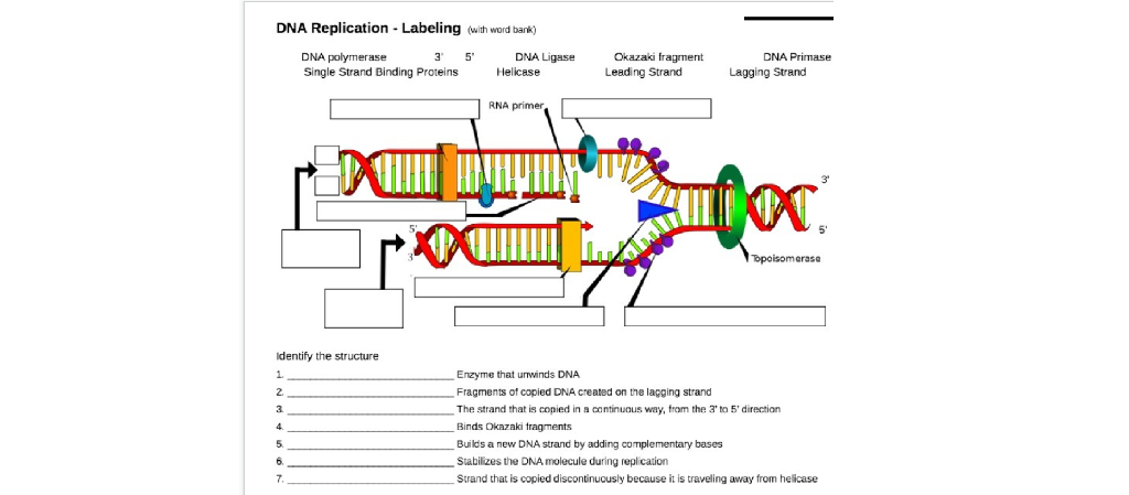 DNA Replication Labeling Diagram | Quizlet Primase An enzyme that creates a short RNA primer for initiation of DNA replication. RNA Primer short segment of RNA used to initiate synthesis of a new strand of DNA during replication The primer synthesized by primase enzyme DNA Polymerase on Leading Strand synthesizes new DNA only in the 5' to 3' direction Ligase